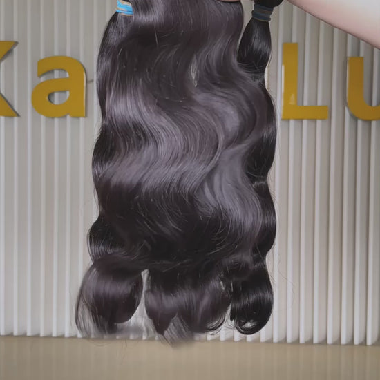 100% human virgin hair which cut from 20-25 years old young girls, very glossy, nutritious and healthy, minimum tangling. Closing quality to Blue rubber band hair